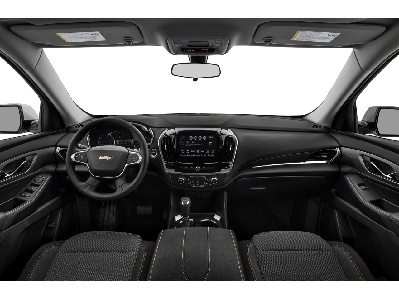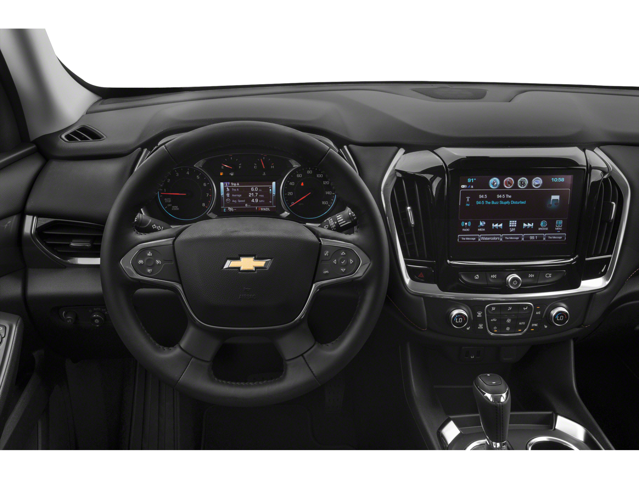 This vehicle comes nicely equipped with Front License Plate Bracket Mounting Package, Preferred Equipment Group 3LT, Traverse 3LT, 3.6L V6 SIDI VVT, Black Leather, 3.49 Axle Ratio, 3rd row seats: split-bench, 4-Wheel Disc Brakes, 6 Speakers, 7-Passenger Seating (2-2-3 Seating Configuration), ABS brakes, Air Conditioning, Alloy wheels, AM/FM radio: SiriusXM, Apple CarPlay/Android Auto, Automatic temperature control, Brake assist, Bumpers: body-color, Compass, Delay-off headlights, Driver door bin, Driver vanity mirror, Dual front impact airbags, Dual front side impact airbags, Electronic Stability Control, Emergency communication system, Four wheel independent suspension, Front anti-roll bar, Front Bucket Seats, Front Center Armrest, Front dual zone A/C, Front fog lights, Front reading lights, Fully automatic headlights, Garage door transmitter, Heated door mirrors, Heated front seats, High-Intensity Discharge Headlights, Illuminated entry, Leather-Appointed Seat Trim, Low tire pressure warning, Occupant sensing airbag, Outside temperature display, Overhead airbag, Overhead console, Panic alarm, Passenger door bin, Passenger vanity mirror, Power door mirrors, Power driver seat, Power Liftgate, Power passenger seat, Power steering, Power windows, Premium audio system: Chevrolet MyLink, Radio data system, Radio: Chevrolet Infotainment AM/FM w/8 Screen, Rear air conditioning, Rear anti-roll bar, Rear reading lights, Rear window defroster, Rear window wiper, Remote keyless entry, Roof rack: rails only, Security system, Speed control, Speed-sensing steering, Spoiler, Steering wheel mounted audio controls, Tachometer, Telescoping steering wheel, Tilt steering wheel, Traction control, Trip computer, Turn signal indicator mirrors, Variably intermittent wipers, Voltmeter, and Wheels: 18 Bright Silver Painted Aluminum.